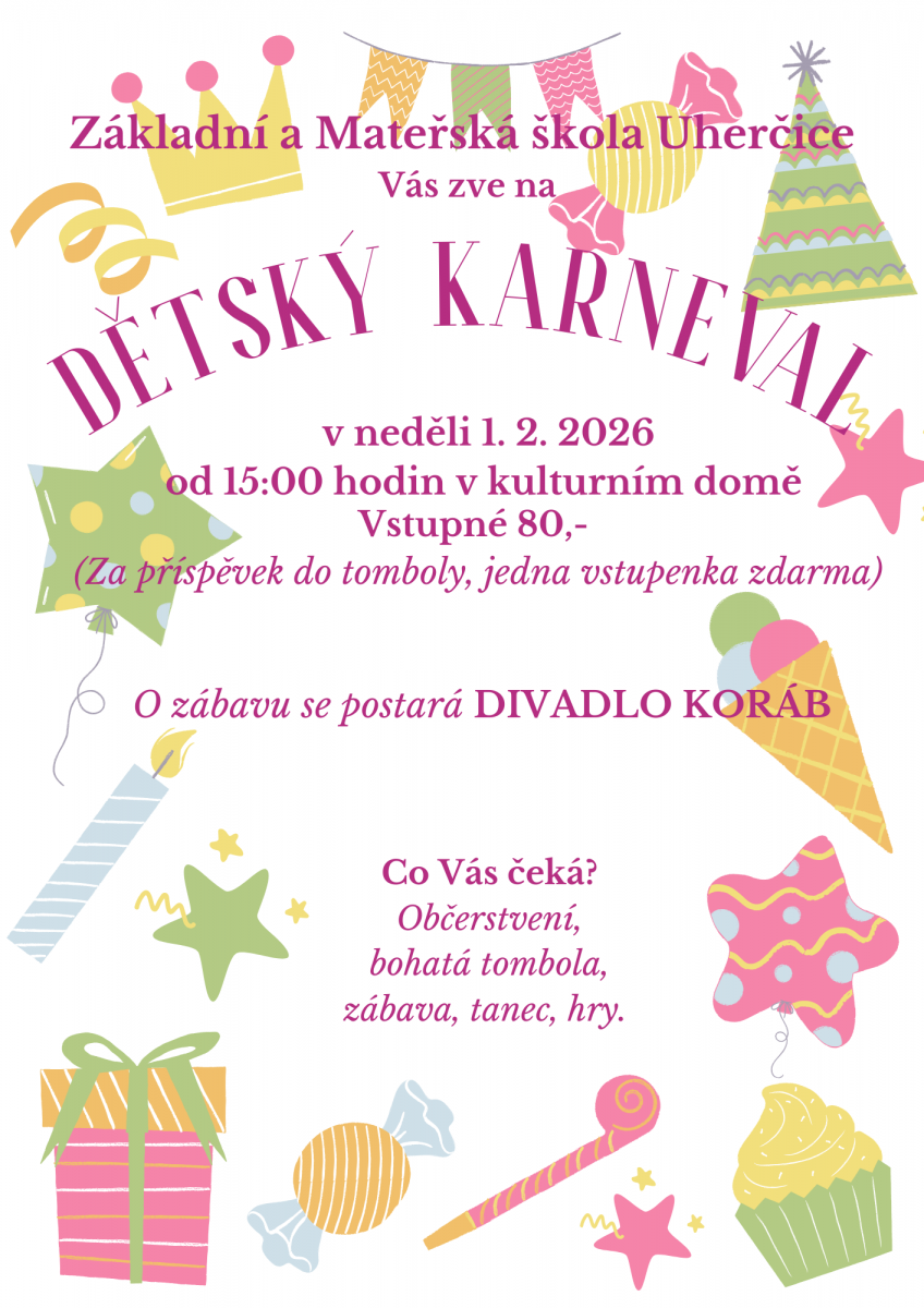 ZŠ a MŠ zve na dětský karneval v neděli 1. 2. 2026 od 15:00 hod. v kulturním domě. Program bude zajišťovat divadlo Koráb a nebude chybět ani občerstvení a bohatá tombola.