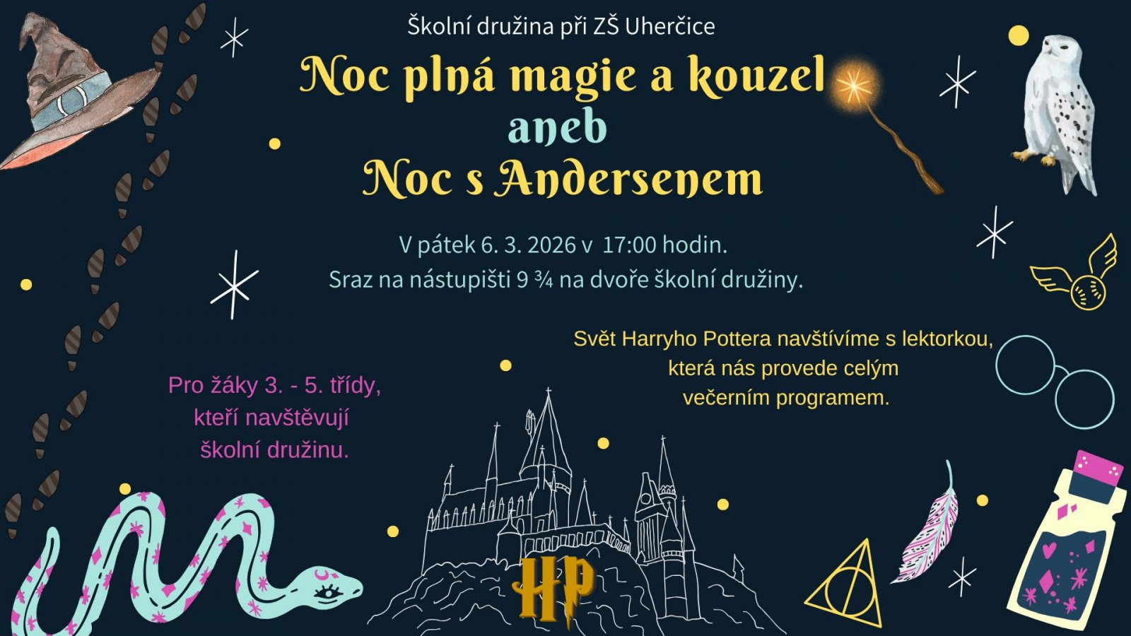 Zveme vás do světa Harryho Pottera, navštívíme spolu místa, kde se filmy natáčely. Paní lektorka přiveze ukázat repliky celé řady věcí, které znáte z filmů, a povypráví o tom, jak se slavný příběh dostal na plátno, jak herci vytvářeli své postavy a kolik skleněných koulí čekalo na ministerstvu kouzel v odboru záhad. Bude vás čekat rozdělení do kolejí, slavnostní hostina, bál, soutěže a noc plná kouzel.
